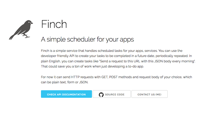 Yalnızca sunmuş olduğu API üzerinden kullanılabilen Finch'te, gerekli token'ı (anahtarı) aldıktan sonra ileri bir tarih için HTTP isteği düzenleyebiliyorsunuz. "Yarında itibaren 15 dakikada bir bu adrese şu veriyi POST ile gönder" gibi görevler tanımlayabildiğiniz kütüphane belki de en çok kullanım kolaylığıyla öne çıkıyor.