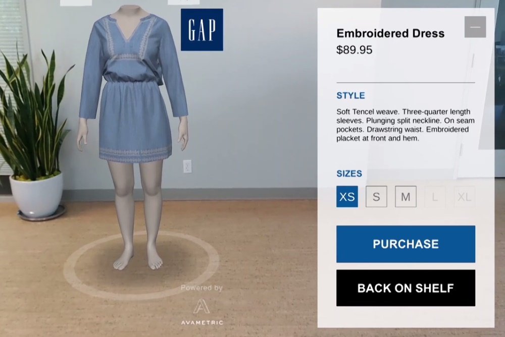 San Francisco merkezli uygulama geliştirme şirketi Avametric ve Google işbirliğiyle GAP için geliştirilen bu uygulama farklı bedenlere göre farklı izlenimler sunabiliyor. Uygulamada satın almak istediğiniz modeli seçtikten sonra 5 farklı beden türüne göre kıyafetin nasıl durduğunu görebiliyorsunuz ve hangisi görünüşü beğenirseniz direkt olarak sipariş verebiliyorsunuz.