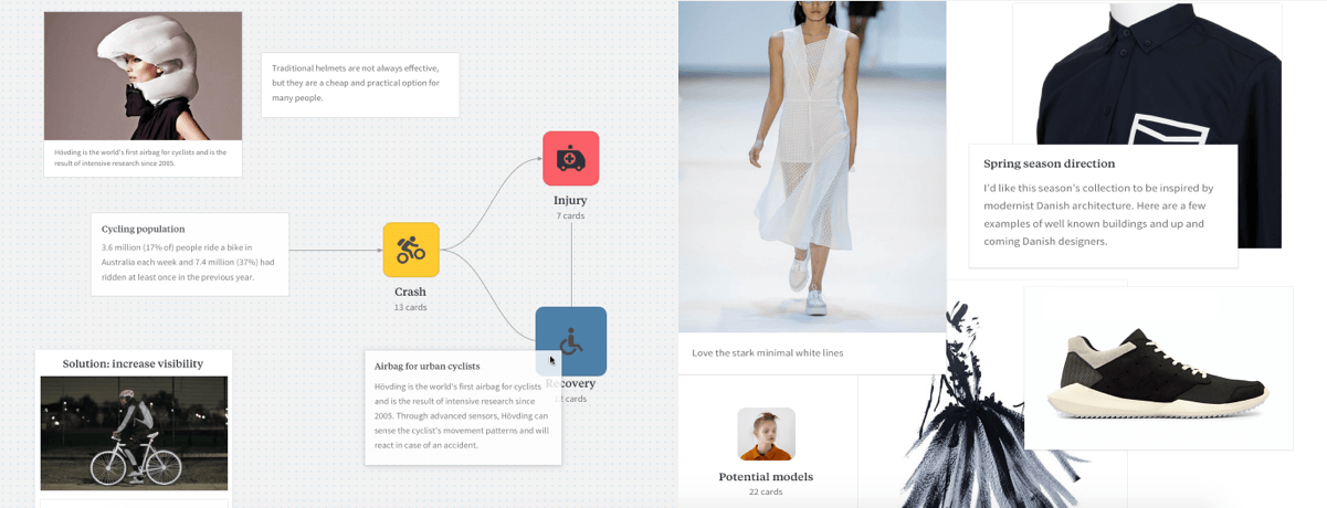 Milanote’u aslında Trello, MindNote ve Google Keep’in bir kombinasyonu olarak tanımlayabiliriz. Milanote da Google Keep ve Trello’dan alışkın olduğumuz notların kartlar içinde sıralandığı bir yaklaşımı içeriyor. Ayrıştığı nokta ise oluşturulan kartların bir pano düzeninde yer alması, bu pano içinde herhangi bir yere taşınabilmesi ve panoya eklenebilen diğer ögelerle MindNote’takine benzer şekilde aralarında bağlantı kurulabilmesi olarak göze çarpıyor. Bu özelliği de Milanote’un farklı amaçlarla kullanılmasını mümkün kılıyor. Örneğin; fikirlerinizi “pinlediğiniz” bir pinboard, notlarınızı içeren bir moodboard veya daha organize şekilde eklediğiniz bir Post-It koleksiyonu.