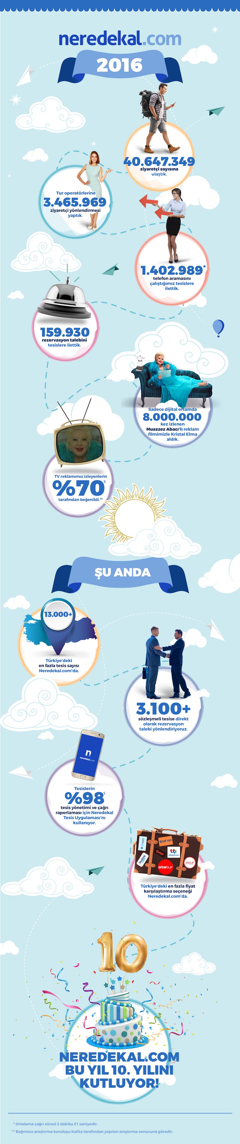 Çağdaş Polat, tüm sektörler açısından zor geçen 2016 yılının turizm sektörünü derinden etkilediğini ama her şeye rağmen Neredekal.com'un yüzde 62’lik bir büyüme gösterdiğini söylüyor ve aşağıdaki infografikte de görebileceğiniz şu rakamlarla Neredekal'ın 2016 yılını özetliyor;