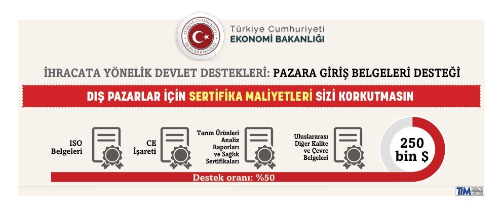 T.C. Ekonomi Bakanlığı'nın ihracata yönelik teşvikleri arasında aşağıda gördüğünüz gibi yüzde 50 oranında sertifika desteği de sunuluyor.