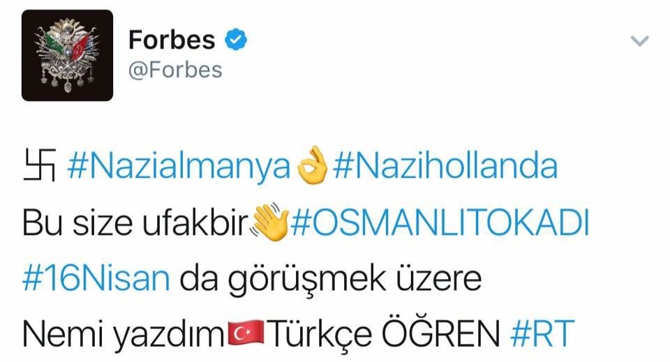 Saldırıya uğrayan tüm hesaplardan #Nazialmanya ve #Nazihollanda etiketleriyle başlayan Türkçe bir Tweet ve Cumhurbaşkanı Recep Tayyip Erdoğan için hazırlanmış bir video paylaşıldı. Ele geçirilen bazı hesapların profil ve kapak görsellerinin Türk bayrağıyla değiştirildiğini de ekleyelim.