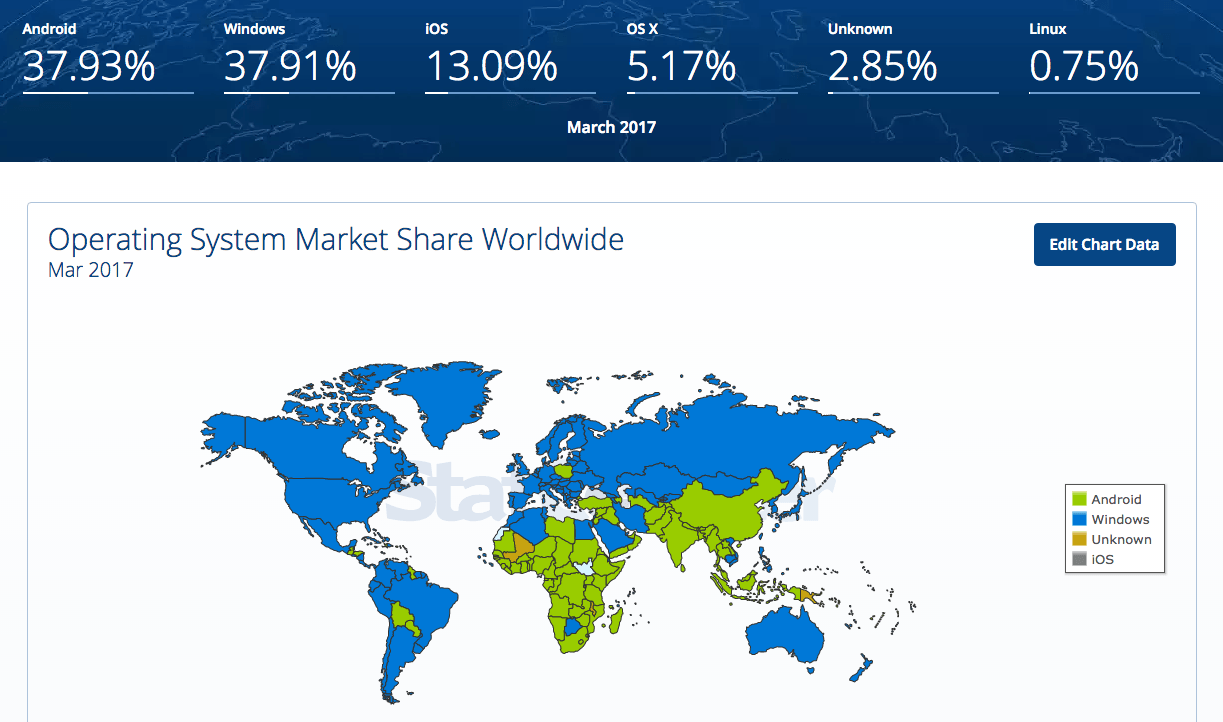 Android'in Windows'un tahtını almasında tahmin edeceğiniz gibi akıllı telefonların yükselişi ve Windows tabanlı masaüstü bilgisayarların gerilemesi gibi iki temel sebep yatıyor. Statcounter, bir diğer önemli sebep olarak da Asya ülkelerinin küresel pazara etki etmesi olarak yorumluyor ki Çinli üreticilerin Android'i ne kadar körüklediğini pekala biliyoruz.