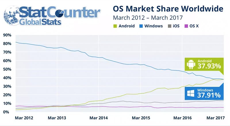 Statcounter'ın yeni raporuna göre Google'ın ana geliştiricisi olduğu açık kaynaklı mobil işletim sistemi Android, internet kullanım süresi açısından Windows'u alt etti. Masaüstü ve dizüstü bilgisayarlarla tablet ve mobil cihazların toplam internet kullanımını dikkate alan araştırmaya göre Mart ayında Android (yüzde 37,93) küçük bir farkla da olsa Windows'u (yüzde 37,91) geride bıraktı.