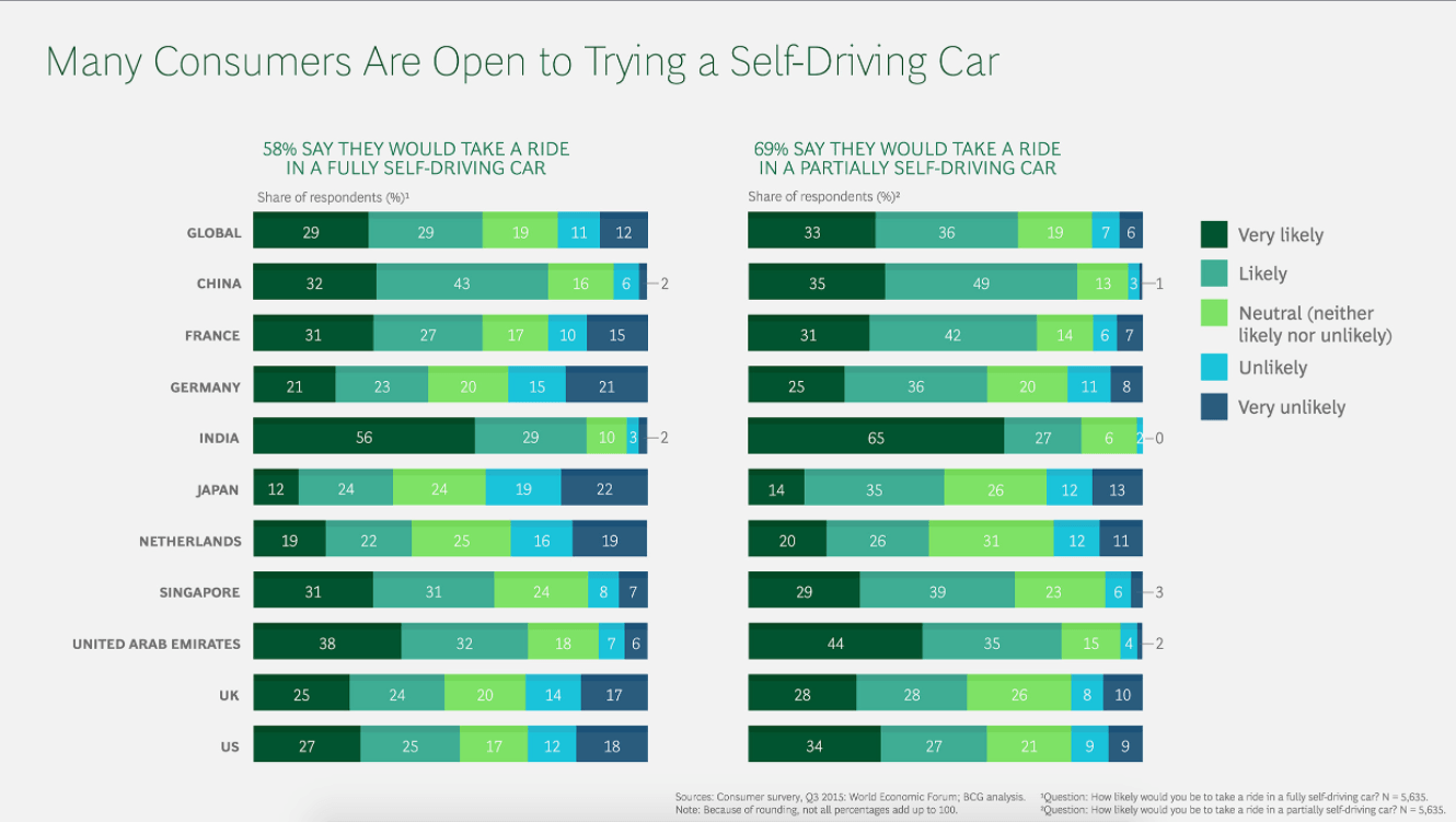Dünyanın 27 farklı şehrinden 5 bin 500 kişiyle yapılan araştırma bu dikeyde yapılan en geniş çaplı araştırma olarak tanıtılıyor. Araştırmanın sonuçlarına göre tüketicilerin yüzde 58'i tamamen otonom bir araca binmek konusunda istekli veya çok istekli. Yarı-otonom araçlara binmeyi düşünenlerin oranıysa yüzde 69'u buluyor. Her iki grupta da tüketicilerin yüzde 19'u konuya nötr yaklaşıyor. Yani tam otonom araçlara olumsuz yaklaşanların oranı yüzde 23 iken, yarı-otonom araçlarda bu oran yüzde 13'e düşüyor.