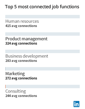 LinkedIn'in en bağlantılı meslekleri, tahmin edebileceğiniz gibi İnsan Kaynakları (İK). Onu Ürün Yöneticiliği ve İş Geliştirme takip ediyor.