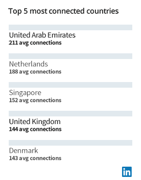 LinkedIn, 500 milyon üyeye ulaştığı duyurusunu paylaştığı yazılı açıklamada, profesyonel ağ üzerinde en çok bağlantıya sahip, ülke, şehir ve endüstrileri de açıkladı. Buna göre, LinkedIn'de ortalama en fazla bağlantıya sahip ülkeler arasında Birleşik Arap Emirlikleri (kişi başına ortalama 211 bağlantı) Hollanda (ort. 188) ve Singapur (ort. 152) ilk üç sırada.