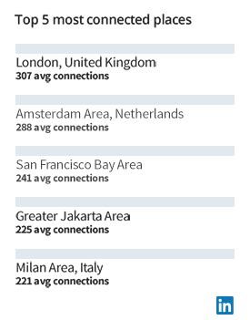 LinkedIn ağında en bağlantılı şehirler ise Londra (ort. 307) Amsterdam (ort. 288) ve San Francisco (ort. 241) oldu.