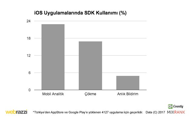 Özetle mobil uygulamalar geliştirirken iOS geliştiricileri daha fazla 3. parti uygulama entegrasyonu yapıyor ve kullanıcıları takip ediyor. Countly ve Mixrank, Türkiye damgalı uygulamalarda hiç SDK entegrasyonu yapmayan uygulama sayısının iOS tarafında yüzde 51, Android tarafında ise yüzde 17 olduğunu paylaşıyor ve bazı kategorilere özel bilgiler paylaşıyor.