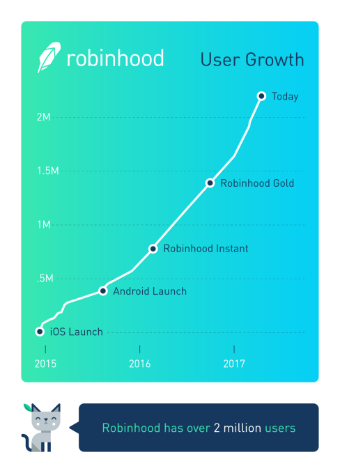 Yatırımcıları tarafından bir internet şirketi gibi hızlı büyüyen "ilk" finans girişimi olarak nitelenen Robinhood'un TechCrunch'a verdiği bilgilere göre, mobil uygulamasının bugün 2 milyon aktif kullanıcısı var. Geçtiğimiz Ekim'de bu sayı 1 milyondu yani Robinhood o tarihten bu yana her ay 140 bin yeni kullanıcı kazandı. Uygulaması üzerinden bugüne kadar 50 milyar dolarlık işlem yapılan Robinhood kullanıcılarına toplam yarım milyar dolarlık bir tasarruf sağladı.