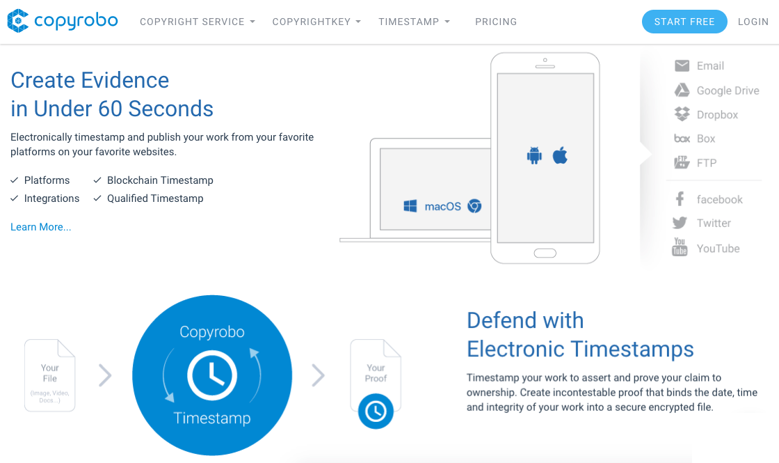 Copyrobo, kısaca telif veya patent korumasına ihtiyaç duyulan belgelerinizi, Blockchain Zaman Damgası (Bitcoin, Ethereum) ve Nitelikli Zaman Damgası (EU Digital Single Market, 910/2014 ve TR 5070 Elektronik İmza Kanunu) ile işaretleyen bir girişim. iOS, Android, Chrome ve Web uygulamaları üzerinden 60 saniye gibi kısa bir sürede mahkemelerde kullanılabilecek bir delil elde etmenizi sağlıyor ve dijital paylaşımlarınızı koruma altına alıyor. Dolayısıyla telif ve patent korumasına ihtiyacı duyan tüm birey ve şirketleri potansiyel müşterisi olarak görüyor.