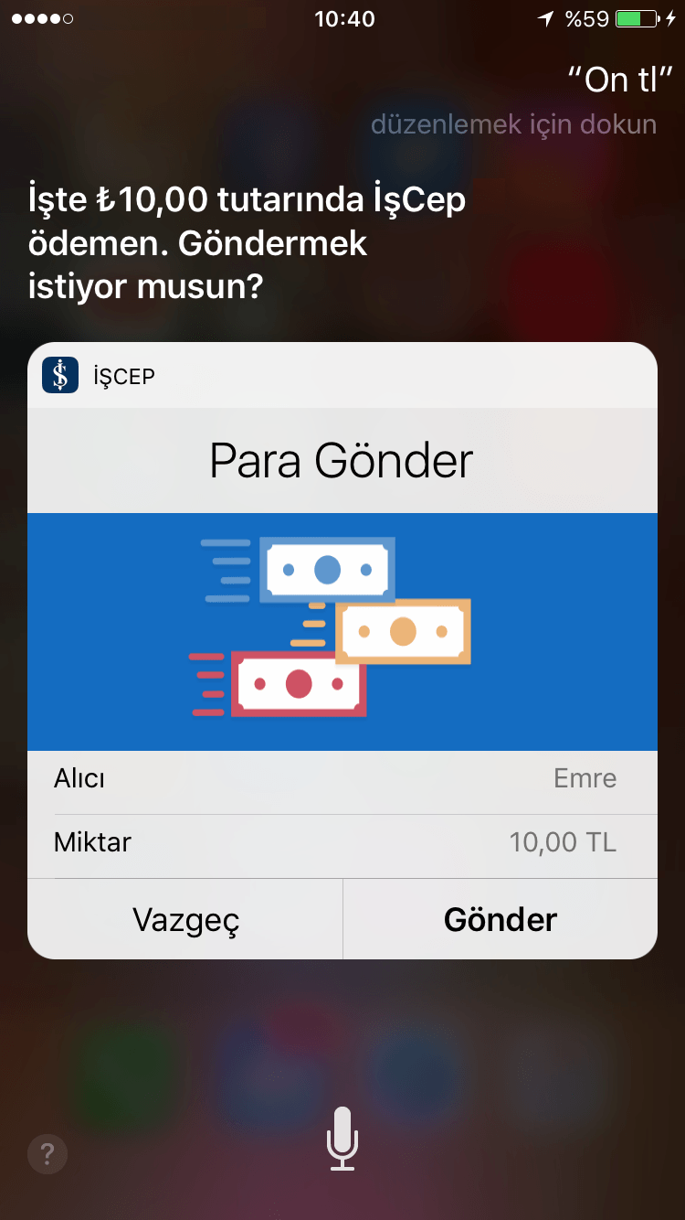 Oldukça basit bir şekilde çalışacak olan ve tek seferde 500 TL’ye kadar kullanılabilecek olan Siri ile havale özelliği, Siri'ye verilecek “Para gönder” komutuyla çalışacak. Siri desteği ile havale işlemlerini kolaylaştırmayı hedefleyen İşCep'in, yakın zamanda Siri ile EFT transfer etme özelliğine kavuşacağını da iletelim.