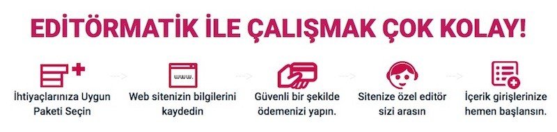 İçerik pazarlaması konusunda akla ilk gelen adreslerden biri olmak isteyen Editormatik.com, müşterlerinin talepleri doğrultusunda Wordpress, Gazisoft ve Tebilişim için API üzerinden de içerik yayını yapabiliyor. Ama elbette her şeyden önce içerik kalitesi geliyor. Eğer siz de içeriğin kral olduğuna inanıyor ve Editormatik.com'un denemek istiyorsanız, ihtiyacınıza uygun bir paket satın alarak işe koyulabilirsiniz.