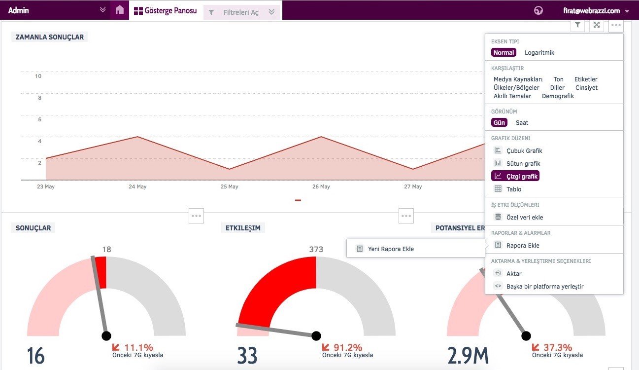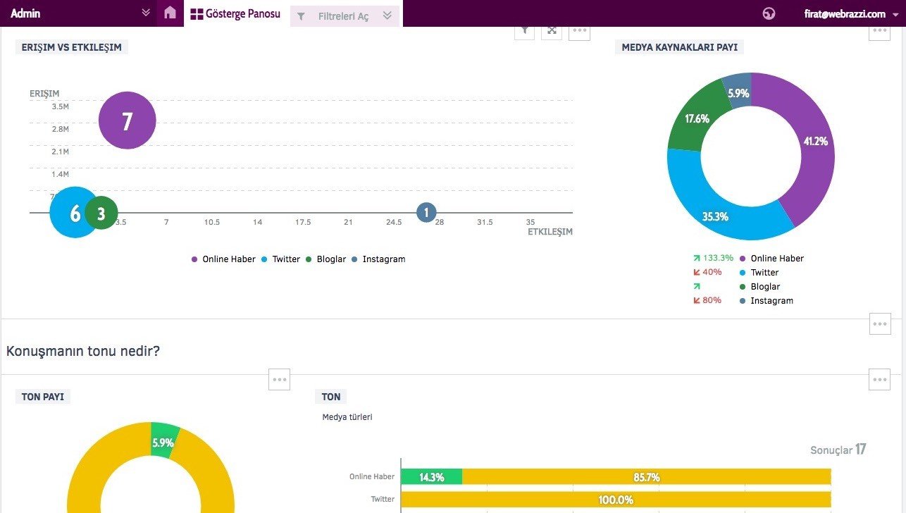 SocialMonitoring, sadece kendi hesabınızın dijital medya takibini yapmakla kalmıyor. Sizinle aynı konuda kampanya çalışması yapan rakip markaları izlemenizi ve kendinizi karşılaştırmanızı mümkün kılıyor. Hakkınızda yapılan paylaşımların kaynaklarını, konuşma tonunu, erişim ve etkileşim durumunu da gözler önüne seriyor.