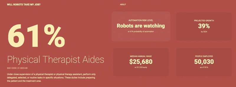 WillRobotsTakeMyJob.com adresine girip mesleğinizi yazdığınızda (maalesef İngilizce) işinizin robotlar tarafından yapılabilme yüzdesini görebiliyorsunuz. Daha önce Webrazzi'de yer verdiğim Carl Benedikt Frey ve Michael A. Osborne'un araştırmasını esas alan bu küçük araç, işinizin risk seviyesini, öngörülen büyüme oranını, çalışan sayısını ve yıllık maaşınızı da gösteriyor. Özetle yeni bir kariyer planı yapmamız konusunda dikkate değer bir sonuç sunuyor.