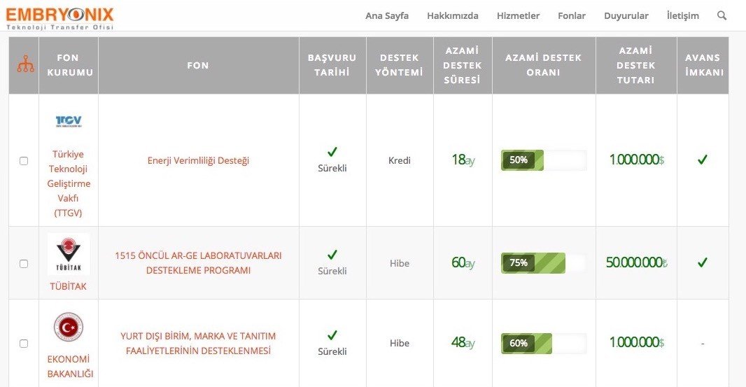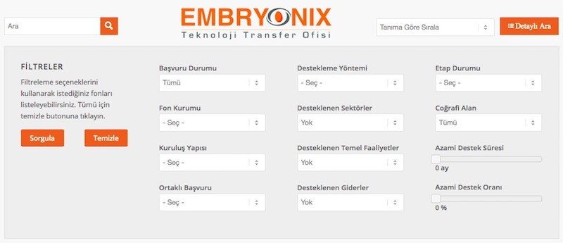 İzmir Ekonomi Üniversitesi’nde Bilimpark A.Ş. ve İzmir Ticaret Odası destekleriyle kurulan Embriyonix TTO'nun hazırladığı araç, TÜBİTAK, KOSGEB, Ekonomi Bakanlığı, Keiretsu Forum Türkiye, Revo Capital gibi resmi ve özel kuruluşların yatırım ve hibe destekleri ayrıntılı olarak listeliyor. Söz konusu fon aracında başvuru durumuna, destekleme yöntemine, temel faaliyetlere ve daha bir çok kritere göre filtreleme yapabildiğiniz gibi coğrafi alan, destek süresi ve destek oranına göre de filtreleme yapabiliyorsunuz.