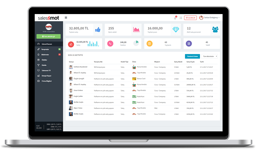 Salesmot’ta şu an için satış, telefon, toplantı ve teklif olarak dört adet senaryo bulunuyor. Ayrıca TL, Euro, GBP, Dolar kuru desteği, yarışma hakem özelliği, detaylı raporlama, ödül sistemi ve akıllı bildirim altyapısı gibi özellikler mevcut. Yazılım üzerinde takımlar, mağazalar, bayiler ve bölgeler oluşturulabiliyor ve personeller bu oluşumların içerisine dahil edilebiliyor.