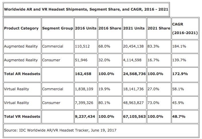 IDC'nin paylaştığı çeyrek rakamlarına göre artırılmış gerçeklik ve sanal gerçeklik başlıklarının sayısı 2016'da 10 milyon adet idi. 2021'de ulaşılması beklenen rakamsa bunun epey üzerinde, tam 100 milyon adet. 2016'da satılan artırılmış gerçeklik başlığı sayısı 162 bin iken, bu sayı 2021'de 24,5 milyona yükselecek. Sevkedilen sanal gerçeklik başlıklarının sayısı ise 5 yıl içinde 9,2 milyondan 67,1 milyona ulaşacak.