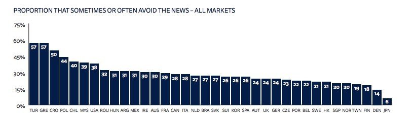 Araştırmada Türkiye'nin ilk sırada olduğu konu bu yıl, haberlerden sakınma oranı. Halihazırda basın yayın organlarına itimat etmeyen kullanıcılar, en çok morallerini bozmamak için haberlerden sakındığını söylüyorlar. İkinci en önemli sebepse yayıncılara güvenmemeleri; üçüncü sırada ise haberi alsa da, yapacak bir şeyi olmadığına yani elinin kolunun bağlı olduğuna inanma hali var.