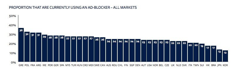 Geçtiğimiz yıl Türkiye'nin en yüksek reklam engelleme oranına sahip olduğu araştırma, bu yıl yayınların önlemleri, abonelik servislerinin yaygınlaşması gibi sebeplerle oranların düştüğünü söylüyor. Türkiye'de katılımcıların yüzde 26'sı reklam engelleyici kullandığını söylüyor bu yıl. Düşüşün en önemli sebebi reklam engelleyicisi açıkken sayfayı görememek.
