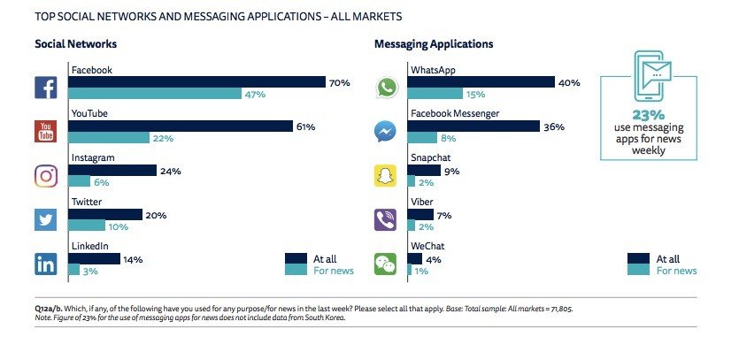 Araştırmaya katılan tüm kullanıcıların yüzde 23'ü haberleri okumak için mesajlaşma uygulamalarına başvuruyor. Mesajlaşmanın haber tüketimi için kullanımında en popüler uygulama WhatsApp, onu Facebook Messenger, Snapchat, Viber veWeChat izliyor.