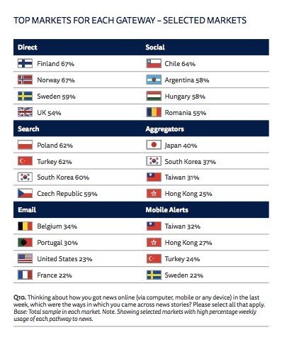 Ancak insanların haberlere erişiminde sosyal medya hala ana kaynak değil. Katılımcıların yüzde 32'si doğrudan sayfaya giderek haberlere erişiyor; yüzde 25'i ise arama motorlarını kullanıyor. Sosyal medya ise yüzde 23 ile üçüncü sırada. Ülkelere göre haberlere erişim kaynaklarında Türkiye'den katılımcıların yüzde 62'si arama yoluyla haberlere eriştiğini söylüyor.