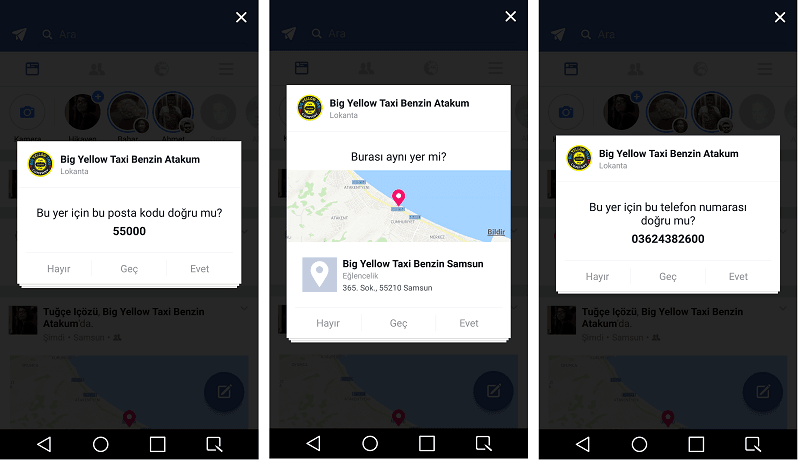 Check-in yaptıktan sonra birden fazla kullanıcıya posta kodu, konum ve telefon numarası gibi bilgileri hakkında sorular yönelten Facebook, bu bilgilerin güncellenmesi ve doğrulanması için ayrıca işletme sayfasına bildirimlerde bulunuyor.