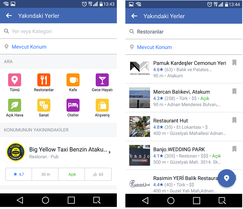 Yakındaki yerler özelliği ile kullanıcılar hem yakınlarındaki mekanları türlerine göre aratabiliyor hem de hepsini aynı sayfada görüntüleyebiliyor. Yine konum odağında kullanıcılarına yakın olanları karşısına çıkaran Facebook, mekanlar hakkında puanı, çalışma saatleri ve fiyat aralığı gibi kısa bilgiler de veriyor. Bu mekanları daha sonra değerlendirmek üzere Facebook'un Kaydet özelliğinden de faydalanmak mümkün.
