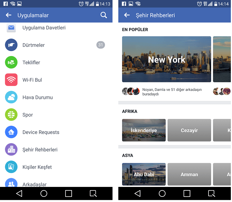 Facebook, Şehir Rehberleri uygulamasında hem popüler şehirleri hem de şehrin popüler konumlarını görmenizi sağlıyor. Arkadaşlarınızın bulunduğu şehirleri görmenizi de sağlayan bu yapı sayesinde seyahatlerinizde yerel işletmeleri güvenle ziyaret edebiliyorsunuz.