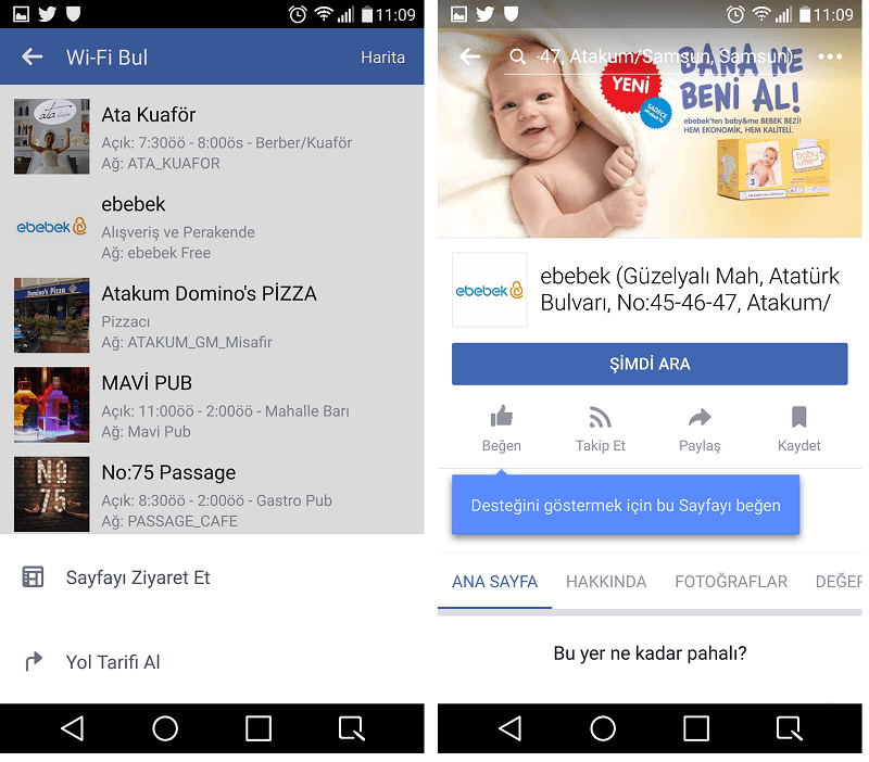 Geçtiğimiz günlerde Wi-Fi Bul özelliği ile yerel işletmelerin öne çıkmasını sağlayan Facebook, kullancıların Facebook'ta daha fazla vakit geçirmesini sağlıyor. Wi-Fi Bul özelliğini kullanırken yakınızdaki ücretsiz WiFi servisi sunan işletmeleri görebiliyorsunuz. Size sunulan işletmelerin üzerine bastığınızda yol tarifi al ve sayfayı ziyaret et seçenekleriyle karşılaşıyorsunuz. Yerel işletmelerin sayfa ziyaretini, beğenisini ve doğrudan işletme ziyaretlerini arttırabilecek olacak bu uygulama da işletmeler ve kullanıcılar için oldukça kullanışlı.
