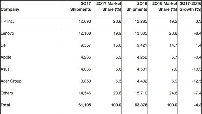 2017 yılının ikinci çeyreğinde 61.105 milyon ünite PC satışa gerçekleşirken bir önceki yılın aynı döneminde 63.876 milyon ünite satış gerçekleşmişti. Geçtiğimiz çeyreği PC pazarının lideri olarak kapatan Lenovo, 2017'nin ikinci çeyreği itibariyle ikinci sıraya geriledi.