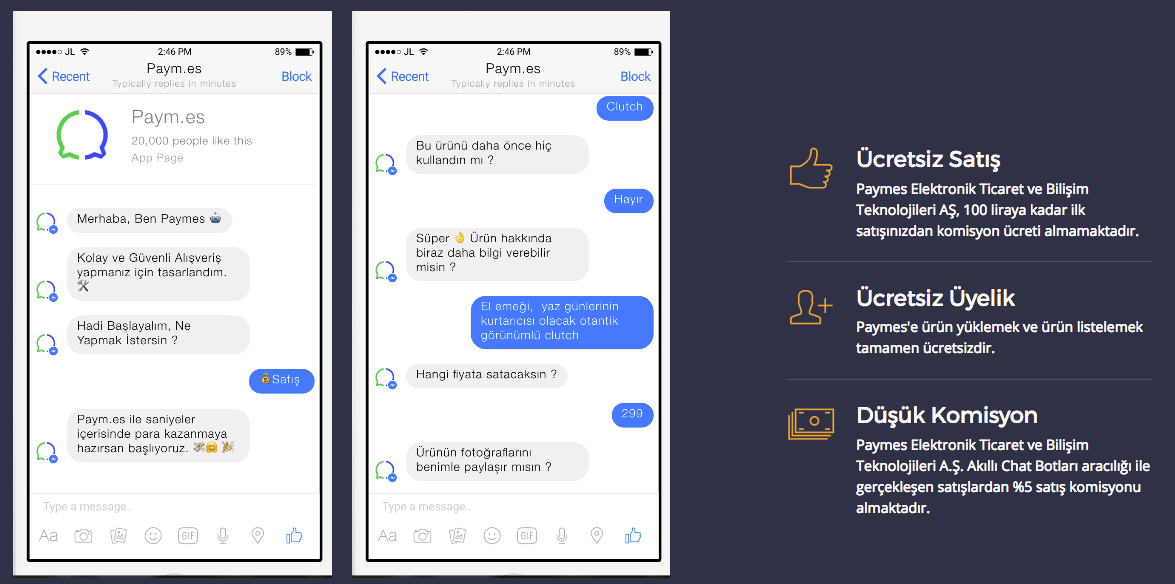 Kullanıcılarına mesajlaşma uygulamaları üzerinden ürün alışı ve satışı imkanı sunan Paym.es, chatbot temelli bir e-ticaret girişimi şeklinde tarif edilebilir.