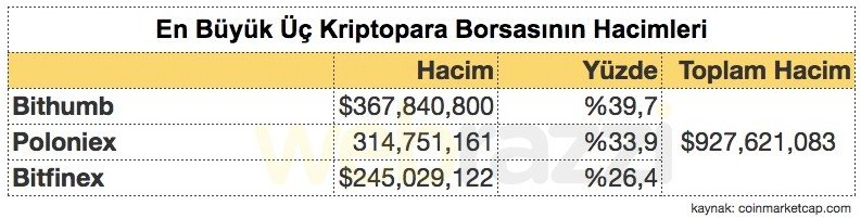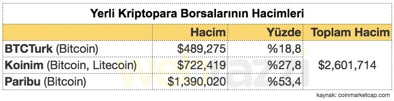Yerli kripto para borsalarının hacimleri toplamda 2,6 milyon dolar seviyesinde, yani güncel kurla 9,1 milyon TL. Bu rakam bir açıdan dikkate değer olsa da toplam pazara baktığımızda halen Türk lirası ile yapılan alım satımların payı çok çok düşük. Elbette Türkiye'den yurt dışındaki borsaları kullananlar da var ancak yerli borsaların hacimleri dünya genelindeki en büyük üç kripto para borsası (Bithumb, Poloniex, Bitfinex) dikkate alındığında sadece yüzde 0,28 yani yaklaşık binde 3 gibi bir pay alıyor.