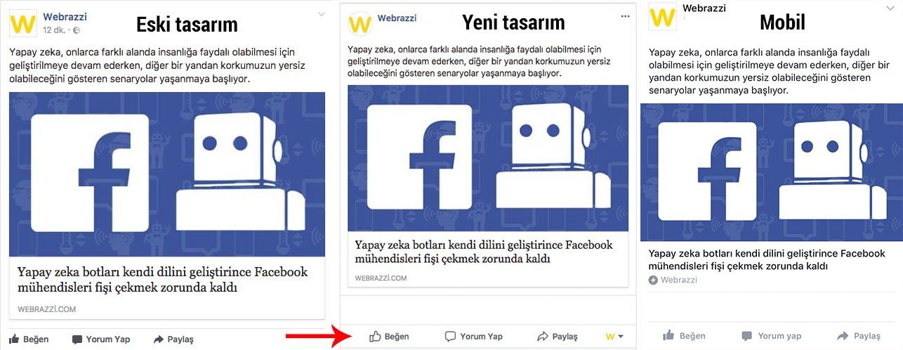 Geçtiğimiz günlerde 2,01 milyar aktif üyeye ulaşan Facebook, tasarım değişiklikleri ile sitesini canlı tutmayı hedefliyor. İçerik etkileşimini artırmak adına çalışmalarını sürdüren Facebook, yeni tasarımının test sürecine başladı. Sınırlı sayıda kullanıcı tarafından test edilen yeni tasarım ile beğen, yorum yap ve paylaş butonları büyüyerek ve sola dayalı halden ortaya alınarak daha dikkat çekici bir hale geldi.