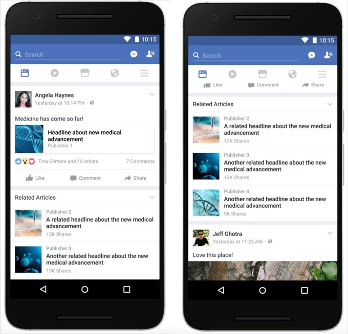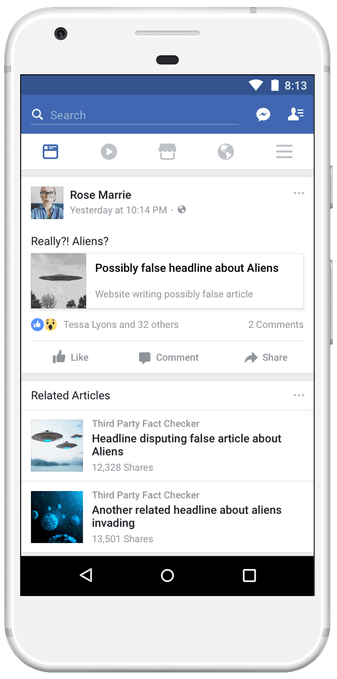 Aşağıdaki örnekte de olduğu gibi, kişinin haber kaynağına düşen haberin hemen altında, linki tıklamadan önce aynı konuyu ele alan kaynaklar tarafından doğrulandığını ya da doğrulanmadığını görmekteyiz. Bu sayede kullanıcılar Facebook'un partnerlerinin gözden geçirdiği ve sahte bulduğu içerikleri görerek, içeriği tıklama ya da tıklamama hakkını kendileri belirleyecek.