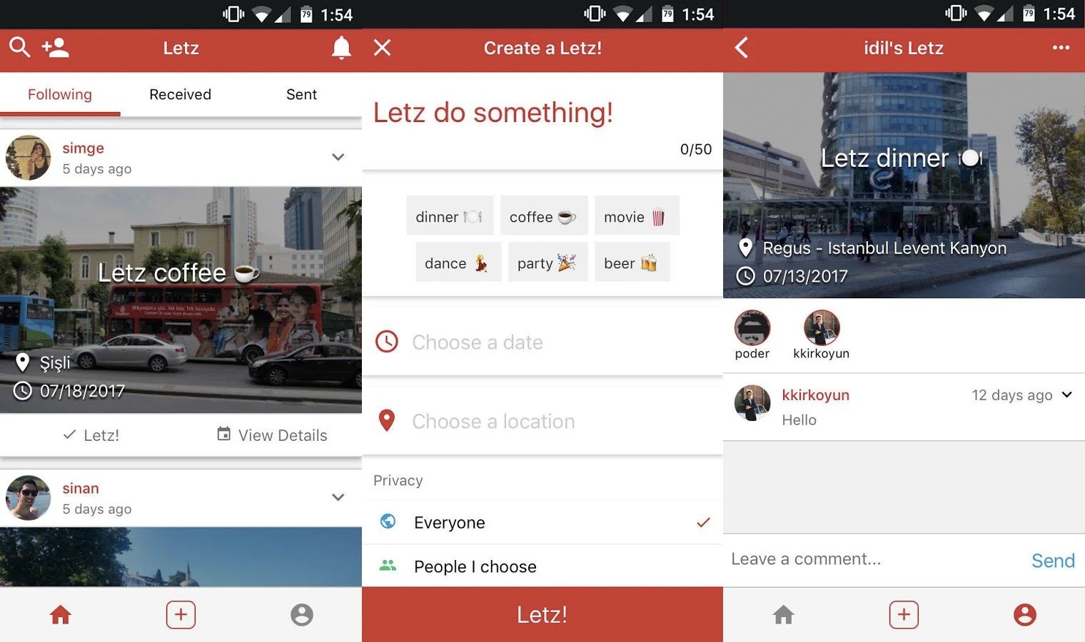 Letz'de kullanıcılar arası özel mesaj özelliği henüz yok ama kullanıcılar, etkinliklerin yorum bölümünde diğer katılımcılarla yazışarak iletişim kurabiliyor. Bu sayede etkinliğe dönük düzenlemeler yapılabiliyor.