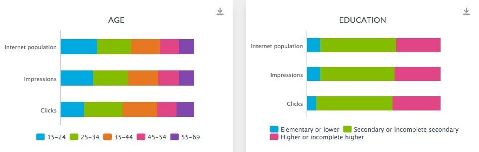 İnternet nüfusunun yüzde 28'ini 15-24 yaş aralığı grup oluştururken onları yüzde 25 ile 25-34 yaş takip ediyor. Yaşlandıkça azalan orana sahip internet nüfusunda 35-44 yaş yüzde 22'yi, 45-54 yaş grubu yüzde 14'ü oluşturuyor. Reklam gösterimlerinde ise 25-34 yaş aralığının yüzde 26 ile başı çektiğini görmekteyiz. Takip eden gruplarsa birbirlerine yakın orana sahip 15-24 ve 35-44 oluyor. İnternet nüfusunda bu kadar etkin olmalarına rağmen reklam gösteriminde 15-24 yaş aralığının daha düşük bir orana sahip olmasını gelir gücü ile açıklamamız mümkün. Tıklamalarda ise durum oldukça ilginç 15-24 yaş grubu yüzde 18'le 3. olarak sıralanıyor. Reklamlar ilgilerini çekmiyor anlaşılan.