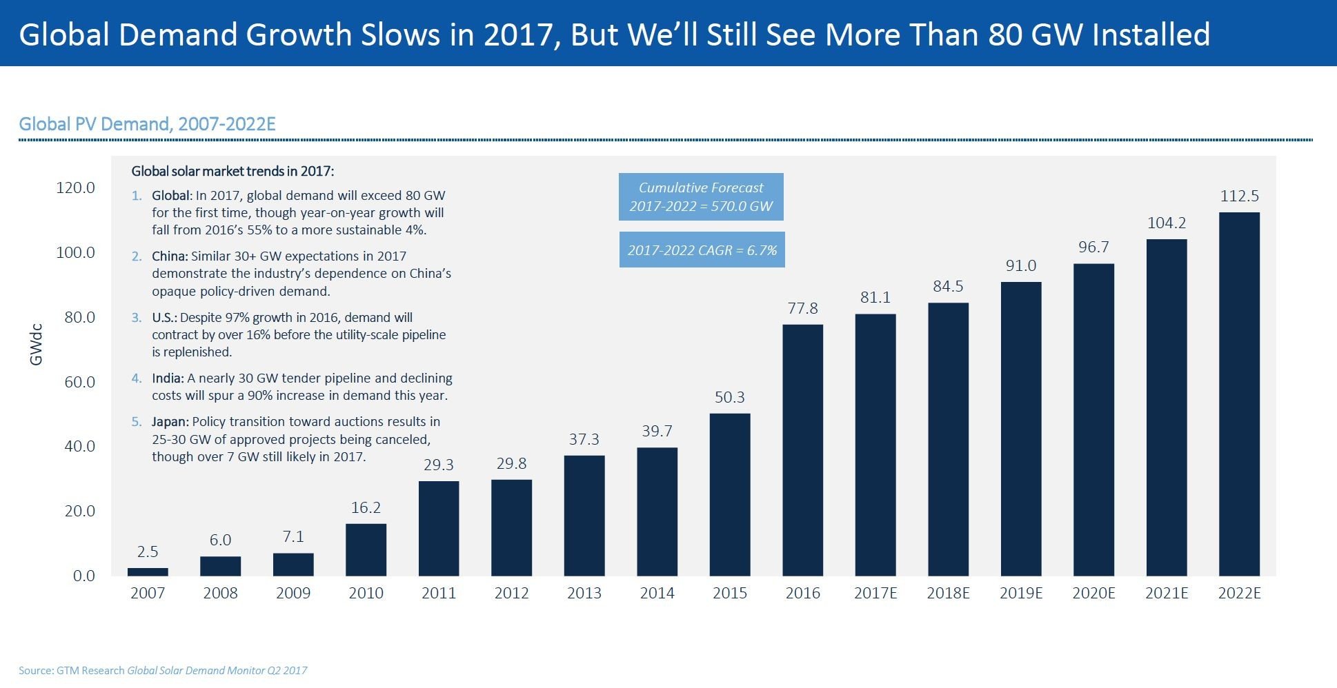 Güneş enerjisi ve enerji depolama üzerine araştırmalar yürüten GTM Research, 2018 yılı itibari ile güneş panellerinin üretebileceği enerji kapasitesinin nükleer enerji tesislerinin üretim kapasitesini geçeceğini açıkladı.