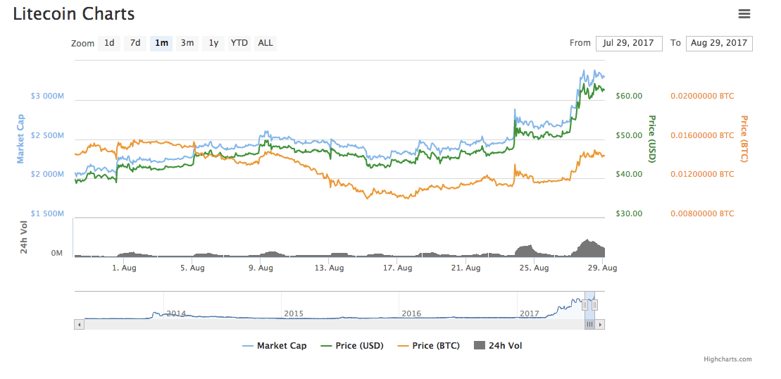 Son bir aydır piyasa değeri neredeyse değişmeyen Litecoin, son 24 saatte ciddi bir dalgalanma yaşadı. Litecoin'in fiyatı bu dalgalanma sayesinde kendi rekorunu kırarak 60 doları geçti. Son 24 saat içinde tüm zamanların en yüksek seviyesine ulaşarak 64.15 dolara ulaşan Litecoin, şu anda 62.11 dolara kadar düşmüş durumda.