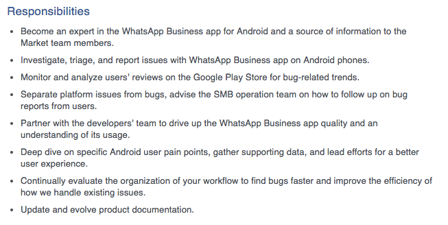 Facebook'un kariyer bölümünde açtığı bir iş ilanı, WhatsApp'ın yeni bir "işletme" uygulaması üzerinde çalıştığını/çalışacağını kanıtlar nitelikte. "WhatsApp işletme uygulaması üzerinde uzmanlaşacak" tabirinin kullanılmış olması, işletmelere özel bir uygulamanın geleceğini gösteriyor. Bu uygulama aracılığıyla Sayalar uygulamasında olduğu gibi yönetimsel işlemler rahatlıkla yapılabilir ve markalara yeni özellikler sağlanabilir.