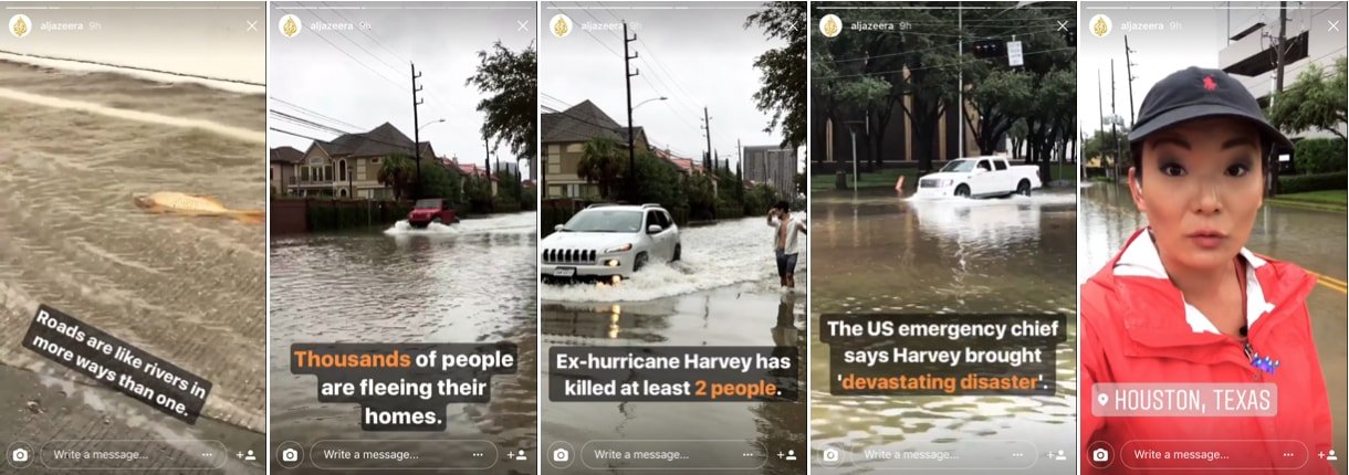 Instagram Hikayeler, önemli anların kullanılmasında da daha etkili bir araç olabilir. Al Jazeera, 28 Ağustos'ta ABD'nin Texas eyaletini vuran fırtınanın getirdiği aşırı yağışların yol açtığı sel felaketini Hikayeler'de çarpıcı görsellerle duyurmuştu.
