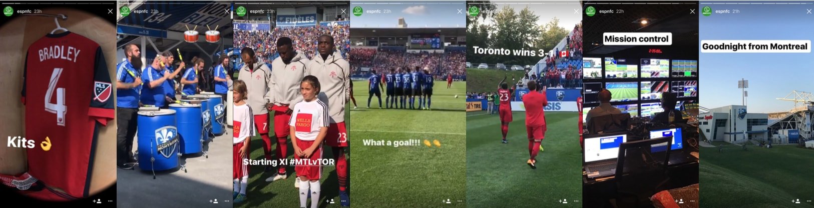 Bazı yayın kuruluşları son dakika haberlerini Al Jazeera gibi yayınlamayı seçerken, bazıları ise önemli anlarını Hikayeler'e sığdırıyor. ESPN FC, Montreal ve Toronto arasında oynanan futbol maçının görüntüleri ile Hikaye oluşturan diğer bir yayın kuruluşu.