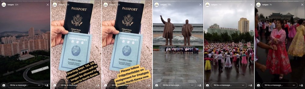Keşif deyince ilk akla gelen yayın kuruluşu şüphesiz National Geographic. Benim de büyük bir keyifle takip ettiğim Instagram hesabında, National Geographic bol bol uzak kültürlerin ve diyarların hikayelerini anlatıyor. Sosyal ağda en fazla içerik paylaşan yayıncılardan biri olan National Geographic, 28 Ağustos'ta Kuzey Kore'de Hermit Krallığı'ndaki hayatı meraklıları ile buluşturdu. Hikayesinde ABD pasaport sahiplerinin 1 Eylül'den itibaren Kuzey Kore'yi ziyaret edemeyeceklerini belirten kanalın, zamanlamayı da doğru kullanarak ses getiren bir Hikaye oluşturduğunu söyleyebiliriz.