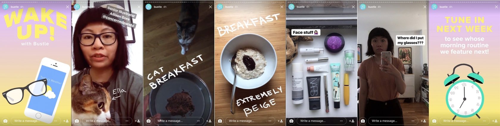 Günümüzde birçok şirket kendi çalışanlarının hikayelerini göstererek takipçilerine daha yakın bir konum yaratıyorlar. Bustle da bunlardan biri. Yayın kuruluşu 'Wake up with Bustle' (Bustle ile Uyan) isimli yarattığı Hikayeler'de gazetecilerinin sabah rutinleri paylaşılıyor.