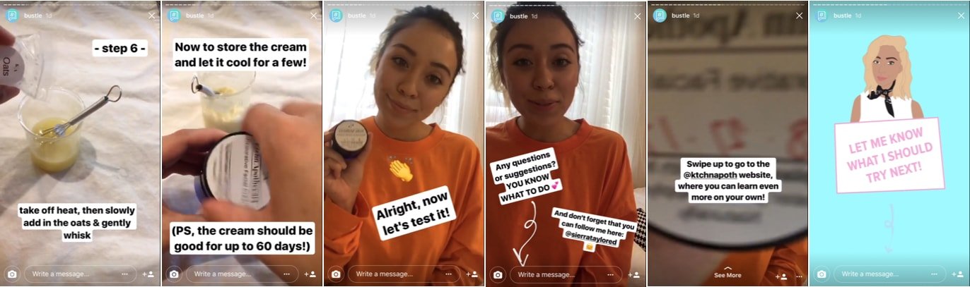 Bustle'ın hazırlamış olduğu öğretici hikayelerde nasıl vücut losyonu yapıldığı yer alıyor. İçeriğin sonunda ise aynı doğal maddelerden yapılmış ürün gösteriliyor. Yayıncıların yanı sıra YouTube ünlülerinin de sıklıkla hazırladıkları bu tarz içerikleri artık Instagram'da çok daha fazla görmekteyiz.
