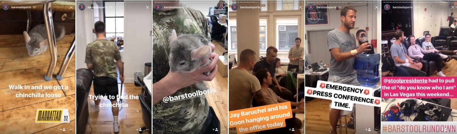 Bu konuda diğer bir örnek ise Instagram Hikayeler'de kendi marka sesini etkili kullanan yayın kuruluşlarından biri olan Barstool Sports. Yayın kuruluşu, ofis içinde bir çeşit tavşan olan çinçilyanın kovalanmasından, ofisteki muzipliklere ve basın toplantısına kadar bir çok anı paylaşıyor.