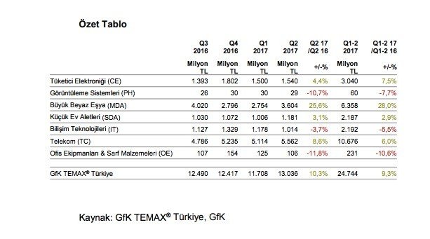 GfK TEMAX'ın araştırmasına göre tüketici teknolojisi ürünleri pazarı 2017 yılının ikinci çeyreğinde bir önceki yıla oranla yüzde 10.3'lük bir büyüme gösterdi. Özellikle beyaz eşya sektöründe devam eden vergi indirimlerinin etkisi ile yükselişe geçen tüketici teknolojisi ürünleri pazarı, yılın ikinci çeyreğinde 13 milyar TL ciro elde etti.