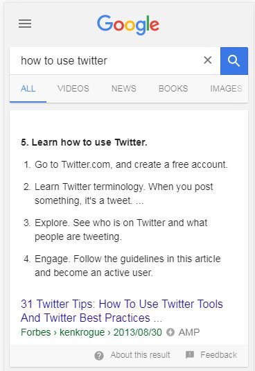 Aşağıdaki örnekte olduğu gibi, Google aramalarında “Twitter nasıl kullanılır?" sorusunun yanıtını Google mobil aramalarında görmekteyiz. Sorunun yanıtı Forbes'ın AMP entegreli Öne Çıkan Snippet'i ile karşımıza çıkıyor.