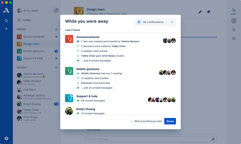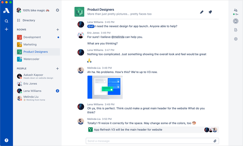 Stride'ın çalışma prensibi Slack'e çok benziyor. Stride'da da sohbet odaları var ve diğer kullanıcılarla birebir konuşmanız mümkün. Üstelik tıpkı Slack'te olduğu gibi konuşmalara ses ve video desteği seçeneğiyle devam edebiliyorsunuz. Tabi bu konuşmaları mobilden, masa üstünden, webden ve telefondan da gerçekleştirebiliyorsunuz.