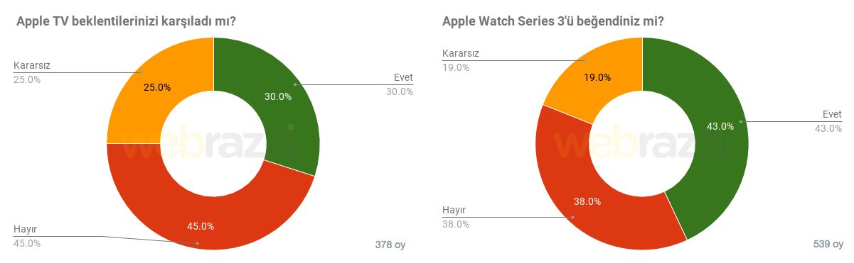 Takipçilerimizin verdiği yanıtlara göre Yeni Appl TV, katılımcıların sadece yüzde 30'unun beklendilerini karşılamış. Ankete katılan kişilerin neredeyse yarısı (%45) tatmin olmadığını belirtirken, her 4 kişiden 1'i de kararsız kaldığını dile getirmiş. Diğer yandan Apple Watch 3, iPhone X'ten sonra en yüksek beğeni oranına sahip. Görüş bildiren takipçilerimizin yüzde 43'ü 3. nesil Apple Watch'u beğendiğini söylerken yüzde 38'i olumsuz yanıt vermiş. Kararsızlar ise yüzde 19'da kalmış.
